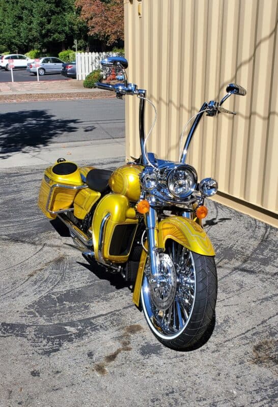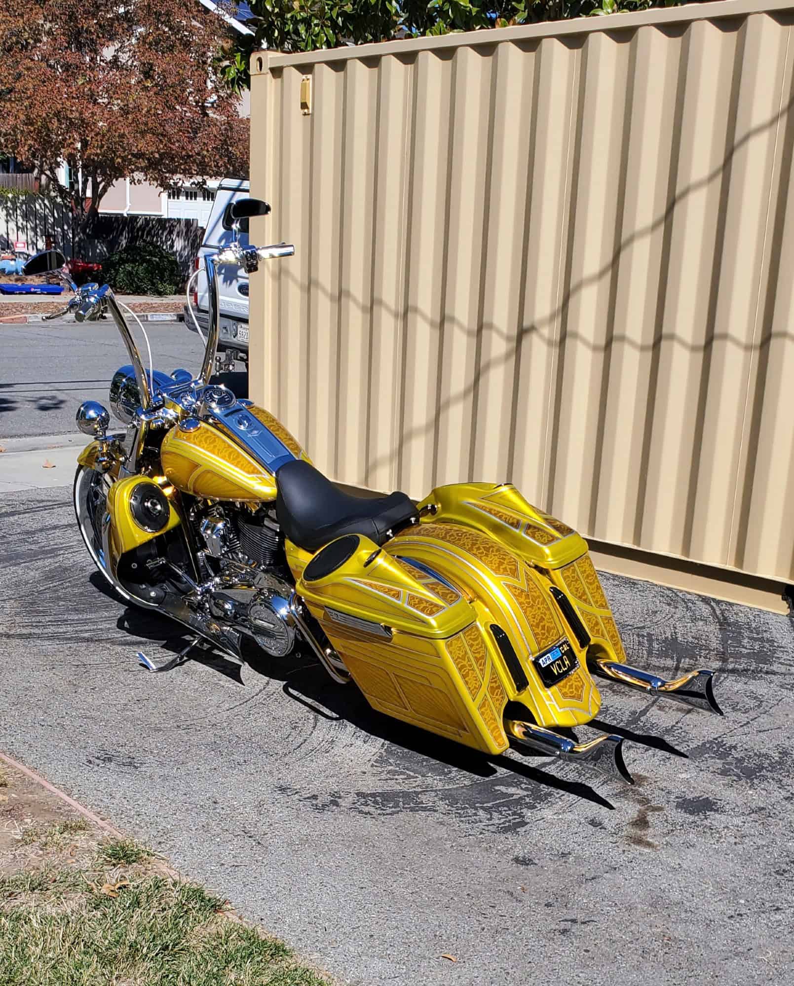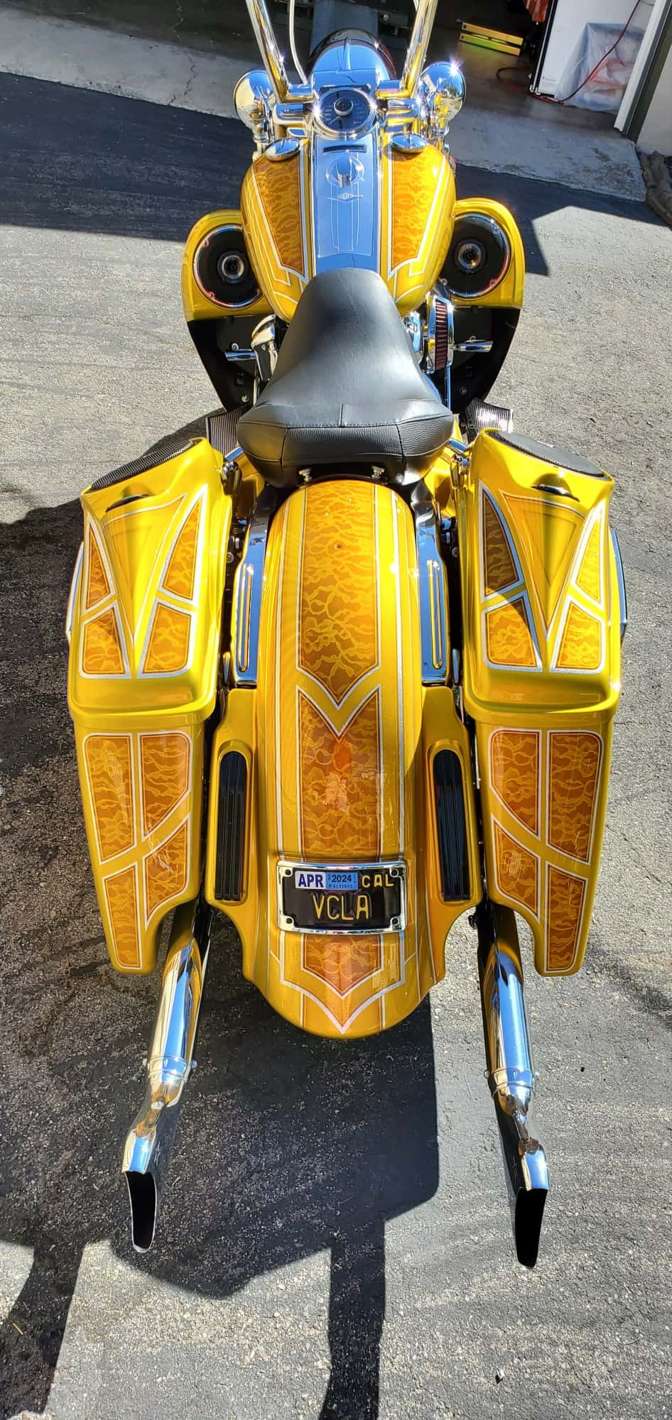 The bike was finished last month and is ready for it's new home, as you can see I didn't cut any corners. Here is a few details of the build…. Ohlins in the rear and Legend cartridges up front and it rides amazing! Cams and Dyno tunned for the 42" Cholos. The Stereo was done by American Hardbags ($7200) and includes 3 amps and 12 speakers (Six 8" woofers, two 6-1/2" mids and four horn tweeters – reguistered 114 dbs). The wheel set up is RC 23/18 with matching 13" rotors and matching Pulley, six piston PM calipers.